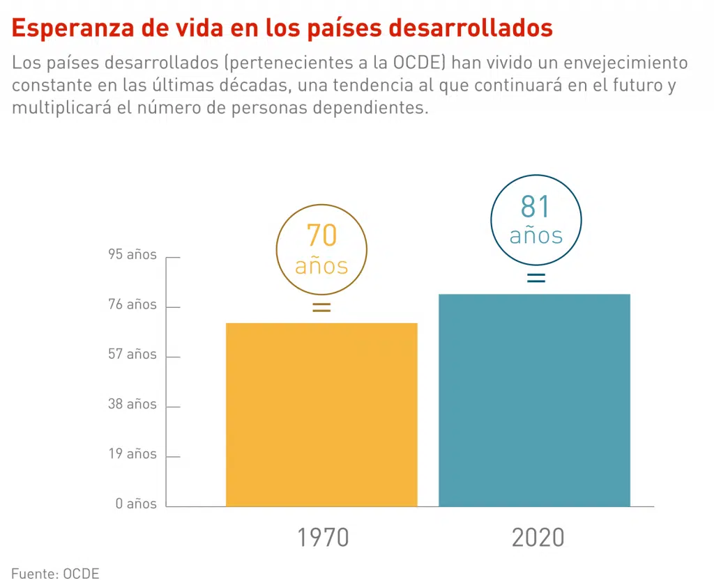 La dependencia tiene su origen en factores como la edad, la enfermedad y la discapacidad. Todas las predicciones, no obstante, coinciden en que el número de dependientes se multiplicará con el envejecimiento de la población, una tendencia que es imparable. En la OCDE (la organización que reúne a la mayoría de los países desarrollados), la esperanza de vida en 1970 se situaba de media en 70 años; justo antes de la pandemia, ya alcanzaba los 81, y seguirá en aumento. Así, los mayores de 65 años, que eran el 9 % del total de la población de estos países en 1960, ya son el 17,3 %, y supondrán el 26,7 % en 2050. Los mayores de 80 años, el grupo que más sufre la dependencia, son hoy el 4,6 % de su población; en 2050, serán más del doble que en la actualidad.