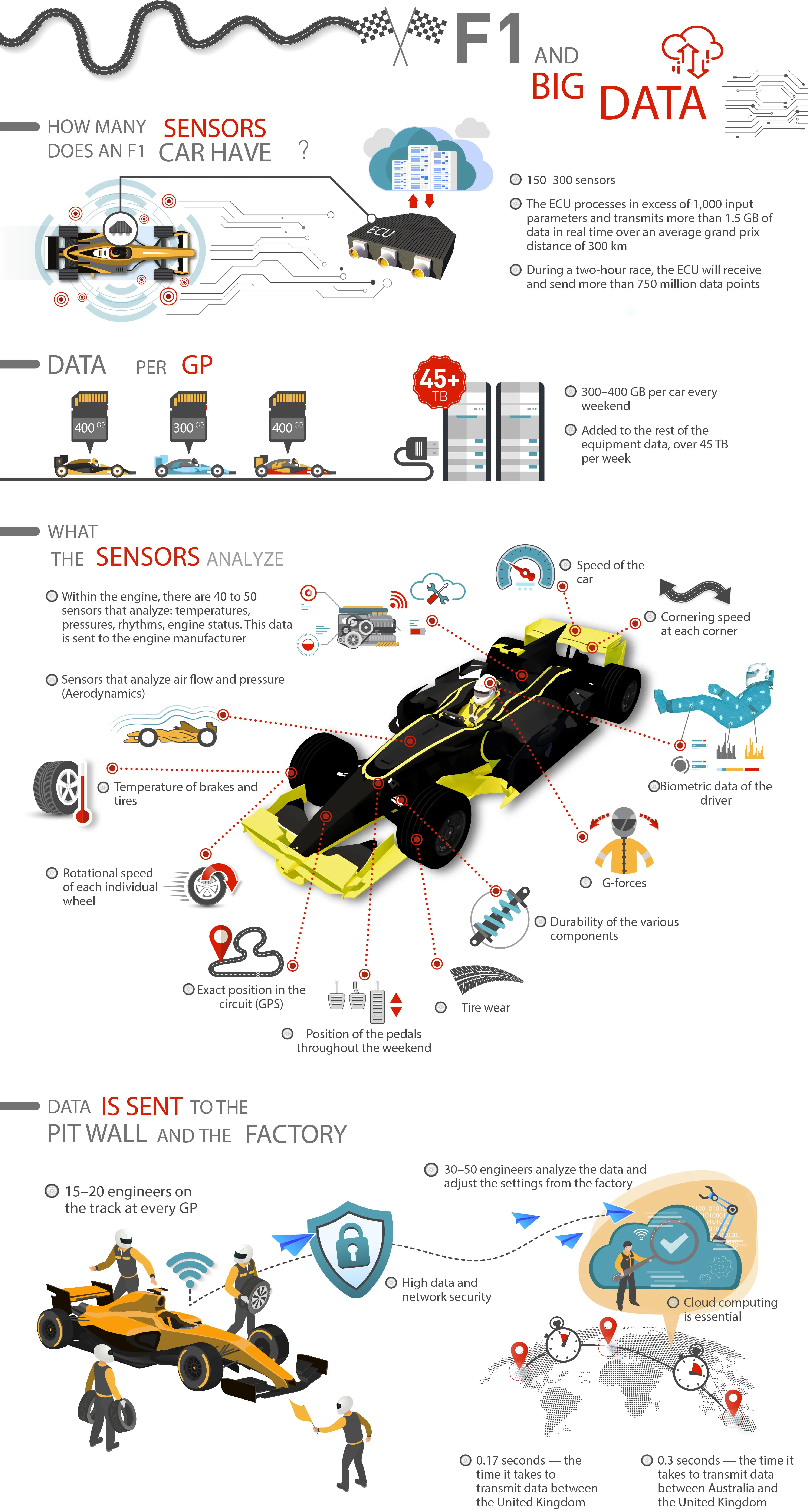What data is generated by a Formula 1 car? How is the data transmitted by the hundreds of sensors on the cars analyzed? How is the information obtained vital to reaching the finish line a second or even millisecond before other racers?