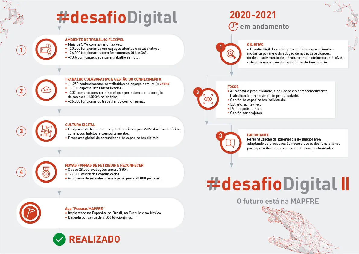 Em 2018, a MAPFRE lançou o Desafio digital para gerenciar a mudança da organização na direção de um ambiente de trabalho adaptado à era digital, ganhando flexibilidade e agilidade, trabalho colaborativo e compartilhamento de conhecimentos, cultura digital e novas formas de retribuir e reconhecer. No início dos anos 2020, o Desafio digital evoluiu (Reto Digital II) para continuar gerenciando as mudanças com a adoção de novas capacidades, o desenvolvimento de estruturas mais dinâmicas e flexíveis e a personalização da experiência do funcionário.