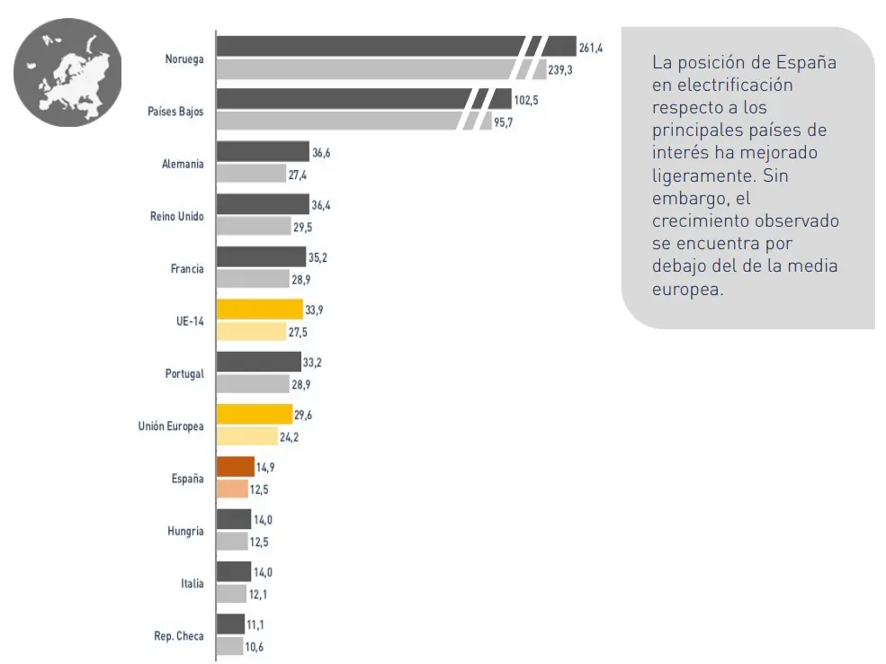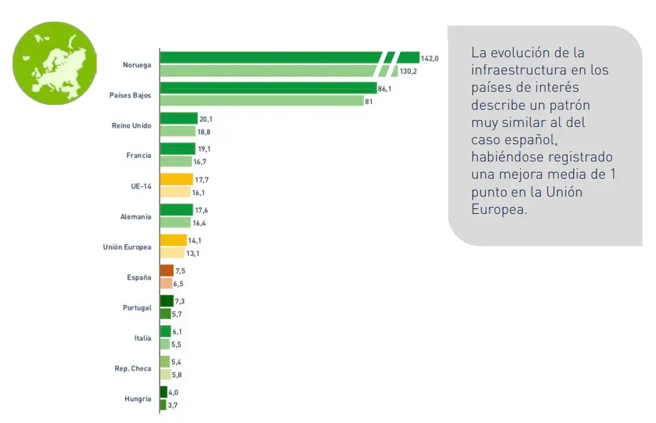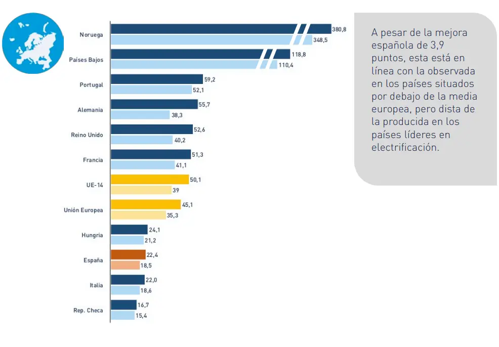 A Espanha saiu do último lugar do indicador de mobilidade elétrica no terceiro trimestre de 2020, porém, ainda está longe da média europeia. Está à frente da Hungria, Itália e República Tcheca.