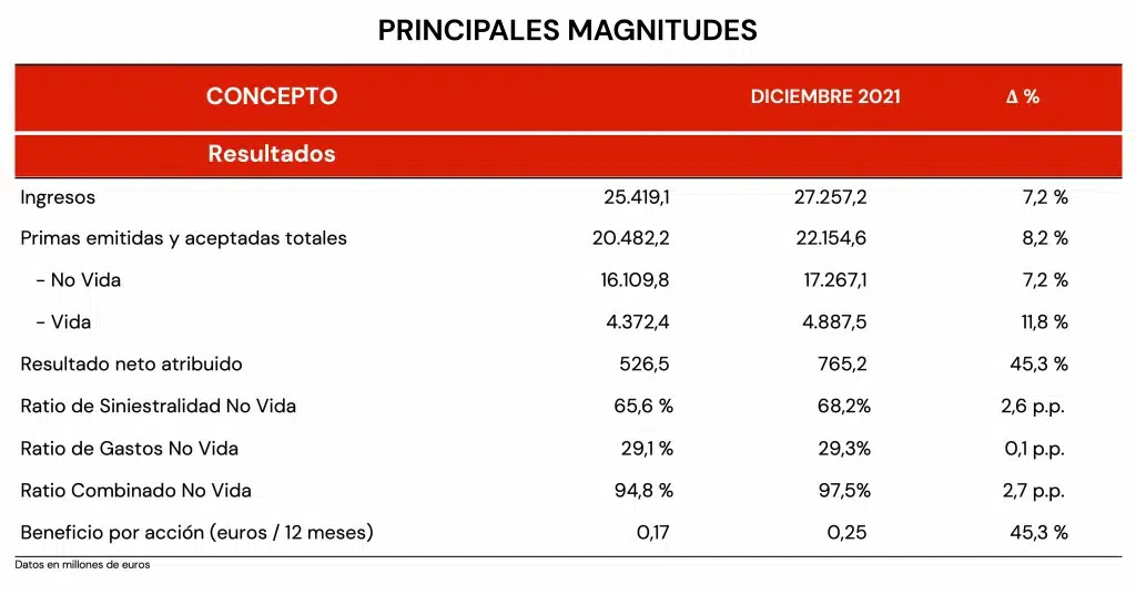 Las primas de la Unidad de Seguros al finalizar 2021 ascendieron a 18.176 millones de euros, un 8,9% más que el año anterior, en tanto que el beneficio fue de 786 millones de euros, similar al logrado en 2020.